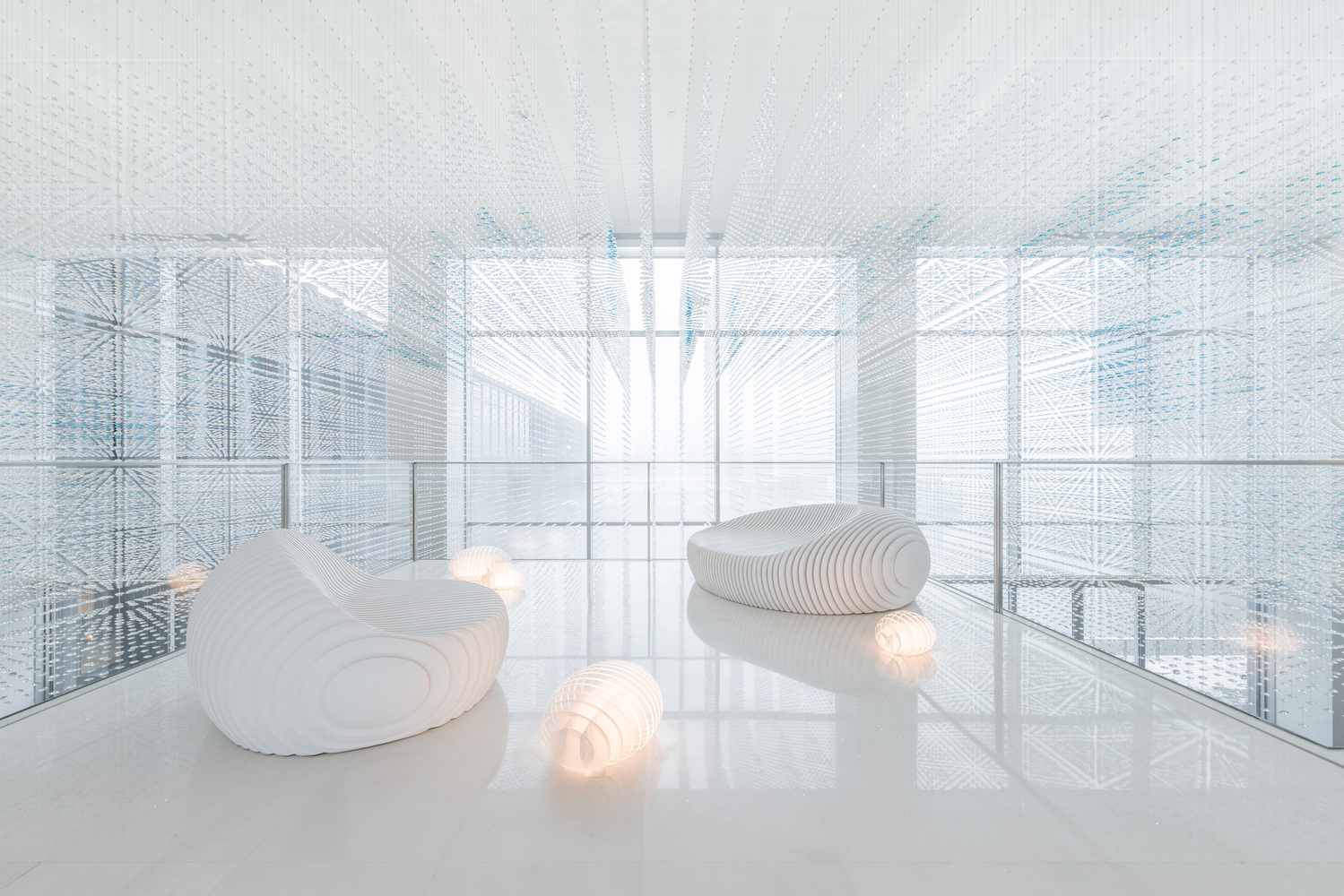 雾气弥漫中,静默地流动于光滑的地面、弧白的墙体、流线型艺术装置之上,令空间在虚实相间的视觉层次中,如水般通透清澈。